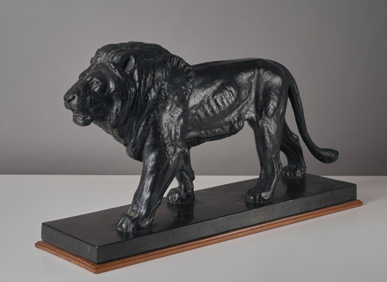 Ce Lion d’Auguste Trémont, bronze fonte d’époque réalisé selon la technique de la cire perdue (36 × 20 × 66 cm), est une œuvre exceptionnellement rare et de tout premier ordre dans la production de l’un des plus grands sculpteurs animaliers du XXᵉ siècle. Trémont y atteint un équilibre remarquable entre observation naturaliste et monumentalité plastique : le corps du lion, puissant et parfaitement construit, révèle une musculature précise, des épaules larges et une posture stable qui exprime une force contenue. Bien que l’animal soit représenté à l’arrêt, une tension interne traverse la sculpture, suggérant une énergie prête à se déployer. La patine brun-noir profonde, caractéristique de ses fontes anciennes, accentue les volumes, les plis du pelage et confère à l’ensemble une noblesse grave et intemporelle.